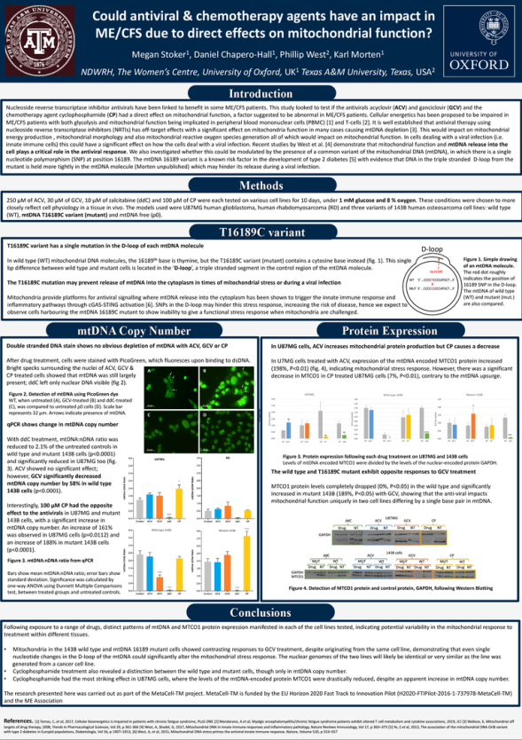 Under conditions which require mitochondrial function to generate ATP, we test human glioblastoma (U87MG), human rhabdomyosarcoma (RD) and two variants of 143B human osteosarcoma cell lines-wild type (clone 12) and mtDNA 16189 variant (clone 1). Cells undergo therapy from 24 hours to ten days with the antivirals acyclovir (ACV), ganciclovir (GCV), zalcitabine (ddC), and the chemotherapy agent cyclophosphamide (CP). We use a combination of fluorescence microscopy, qPCR, western blots and multiplexed intracellular O2, mitochondrial membrane potential and superoxide production assays to understand drug effects on mitochondrial function and protein expression, with interesting results to date.
