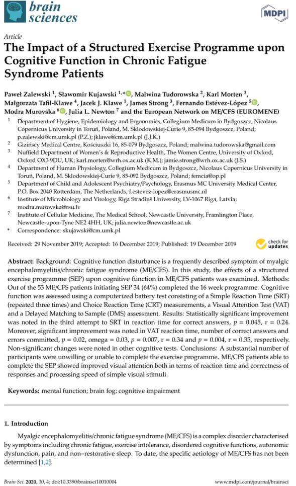 Background: Cognitive function disturbance is a frequently described symptom of myalgic encephalomyelitis/chronic fatigue syndrome (ME/CFS). In this study, the effects of a structured exercise programme (SEP) upon cognitive function in ME/CFS patients was examined. Methods: Out of the 53 ME/CFS patients initiating SEP 34 (64%) completed the 16 week programme. Cognitive function was assessed using a computerized battery test consisting of a Simple Reaction Time (SRT) (repeated three times) and Choice Reaction Time (CRT) measurements, a Visual Attention Test (VAT) and a Delayed Matching to Sample (DMS) assessment. Results: Statistically significant improvement was noted in the third attempt to SRT in reaction time for correct answers, p = 0.045, r = 0.24. Moreover, significant improvement was noted in VAT reaction time, number of correct answers and errors committed, p = 0.02, omega = 0.03, p = 0.007, r = 0.34 and p = 0.004, r = 0.35, respectively. Non-significant changes were noted in other cognitive tests. Conclusions: A substantial number of participants were unwilling or unable to complete the exercise programme. ME/CFS patients able to complete the SEP showed improved visual attention both in terms of reaction time and correctness of responses and processing speed of simple visual stimuli.